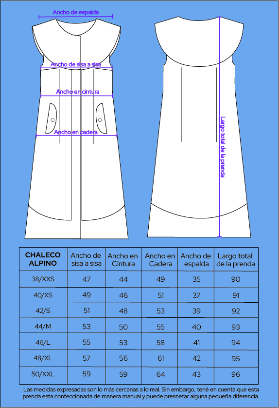 > Tabla de medidas de la prenda: En este caso, vas a poder ver las medidas que tiene la prenda en cada uno de sus talles, para que puedas compararlas con una prenda que vos ya tengas. Las medidas debes tomarlas justamente en el mismo lugar que indica el dibujo (esto es super importante) y siempre en plano sobre una mesa.