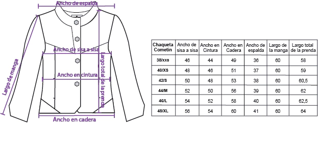 > Tabla de medidas de la prenda: En este caso, vas a poder ver las medidas que tiene la prenda en cada uno de sus talles, para que puedas compararlas con una prenda que vos ya tengas. Las medidas debes tomarlas justamente en el mismo lugar que indica el dibujo (esto es super importante) y siempre en plano sobre una mesa.