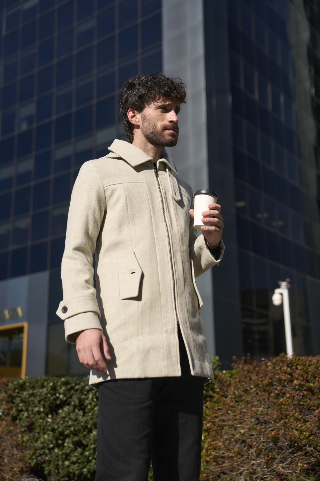 Su corte recto, que cae justo debajo de la cadera, favorece una silueta elegante sin perder comodidad. Este abrigo cuenta con dos bolsillos delanteros con tapa y boton, pensados para llevar lo esencial con estilo y practicidad.
