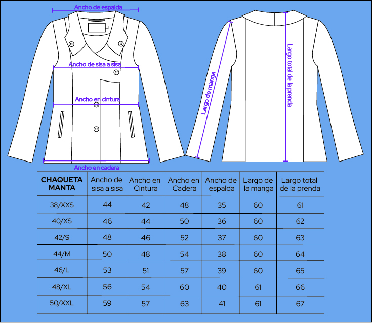 > Tabla de medidas de la prenda: En este caso, vas a poder ver las medidas que tiene la prenda en cada uno de sus talles, para que puedas compararlas con una prenda que vos ya tengas. Las medidas debes tomarlas justamente en el mismo lugar que indica el dibujo (esto es super importante) y siempre en plano sobre una mesa.