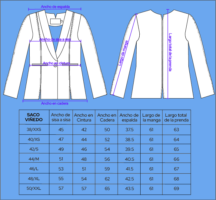 > Tabla de medidas de la prenda: En este caso, vas a poder ver las medidas que tiene la prenda en cada uno de sus talles, para que puedas compararlas con una prenda que vos ya tengas. Las medidas debes tomarlas justamente en el mismo lugar que indica el dibujo (esto es super importante) y siempre en plano sobre una mesa.